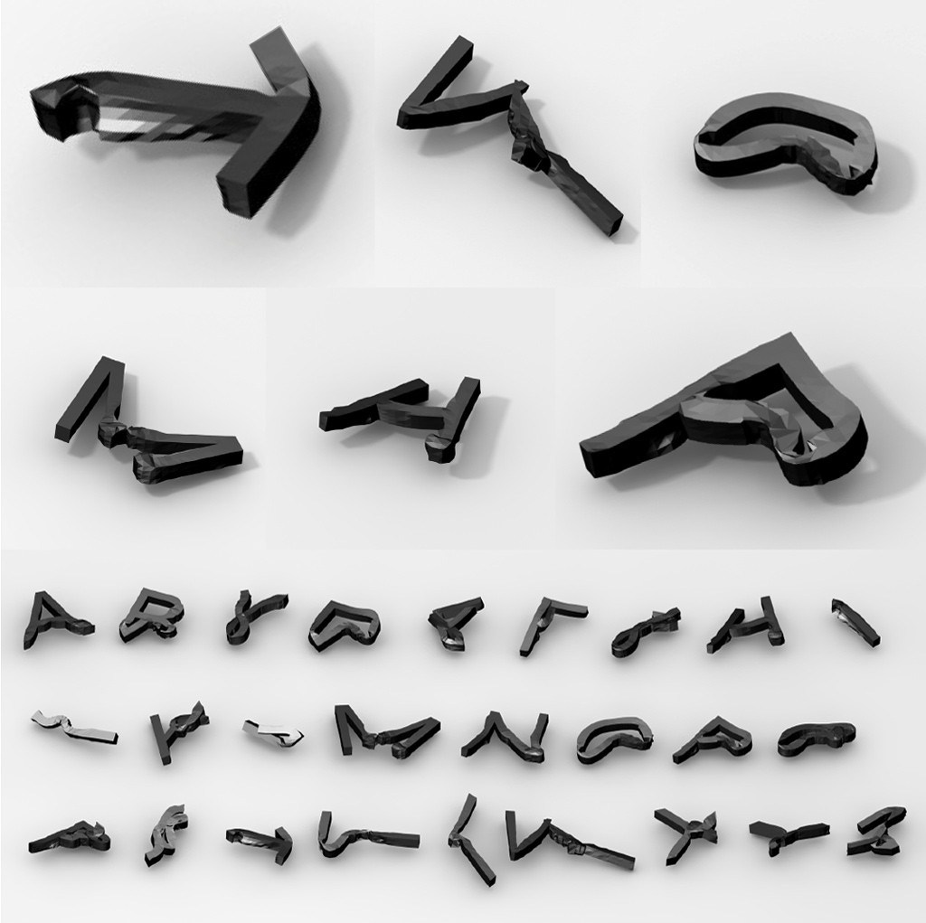 Due to the different treatment of the font’s plane and curved surfaces through the tessellation algorithm, the subdivision of its nurbs surfaces into polygons, volumes of different structural strength are formed within one character. Curved volumes are generally stiffer than flat regions due to the higher structural resolution. During the simulation each font is accelerated and the deformation at impact on a collision object is calculated and stored. However, the simulation has its limitation: the simulation does not calculate tearing of geometry and does not recognize intra-geometric penetration.